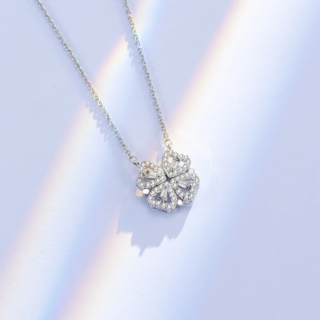 The Necklace can be worn in 2 ways: lucky Clover and romantic four Hearts. The pendant magnetically joins the hearts into the clover.
